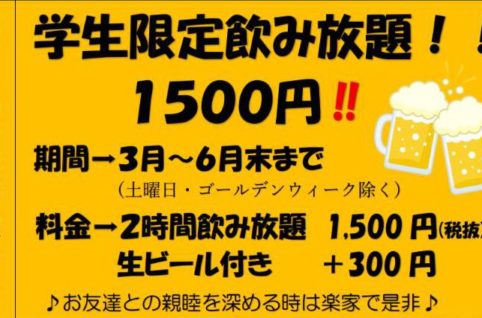3〜6月のイベント ⭐︎⭐︎学生限定飲み放題1500円!!⭐︎⭐︎ 期間:6月末まで(土曜日・ゴールデンウィーク除く) 料金:2時間飲み放題 1,500円(税抜)、生ビール付き+300円 4〜6月のクーポン 配布予定内容...